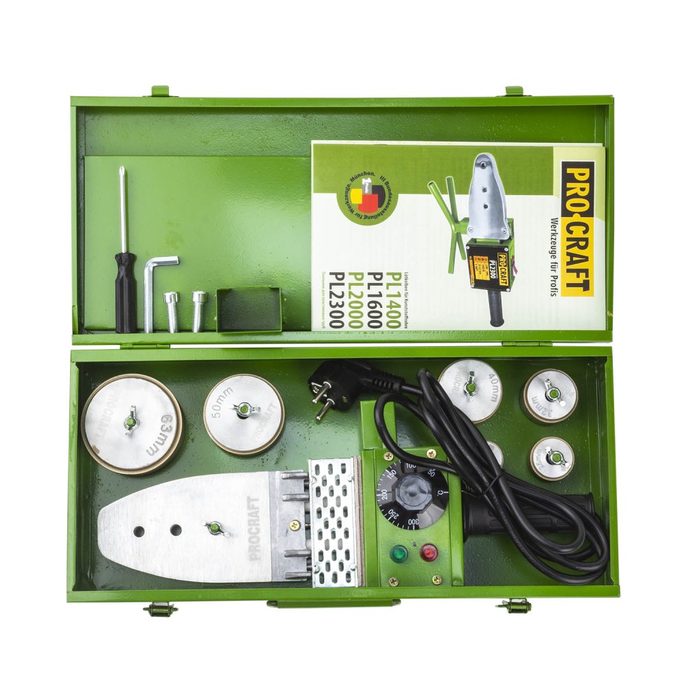 Polyfúzní svářečka Procraft je určena k svařování plastových trubek z homopolymer polypropylenu, PPC, PPR a PELD. Regulace teploty v rozsahu 0-300°C umožňuje nastavení optimálních parametrů při práci s různými materiály. Sada nástavců zaručí svařování potrubí homopolymeru, 20 do 63mm. Lehká a kompaktní konstrukce umožňuje práci v omezeném prostoru. Součástí dodávky jsou nástavce s teflonovým povrchem D20/25/32/40/50/63mm, kovový kufřík, šroubovák, imbusový klíč. Balení karton.
