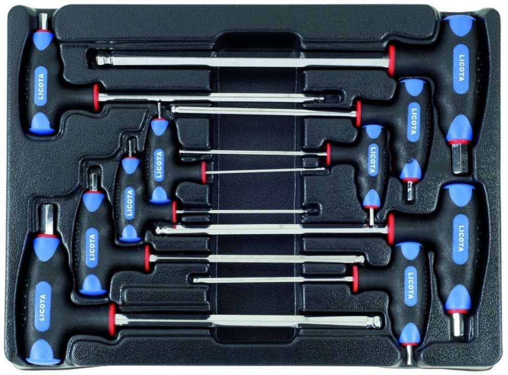 Sada imbusových klíčů s kuličkou v plastové výplni do zásuvek vozíků, T rukojeti, značka LICOTA, velikost 2 - 12 mm.