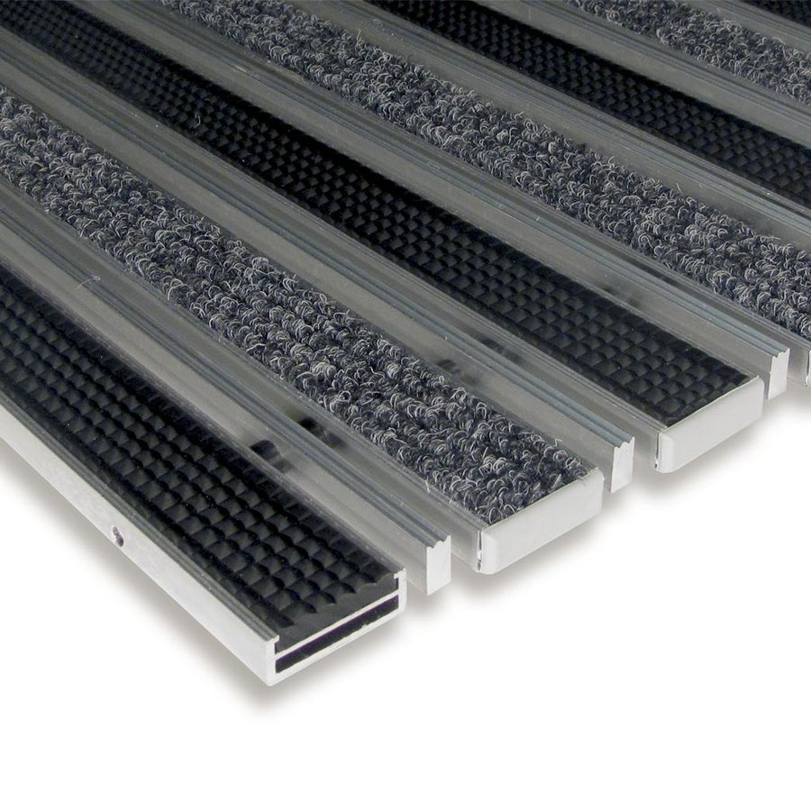 Základem rohože Alu Low Extra jsou pevné hliníkové profily o šířce 27 mm, které jsou navzájem spojeny odolným nerezovým lankem a odděleny pružnými pryžovými mezikroužky. Tato konstrukce zajišťuje vysokou stabilitu, dlouhou životnost a zároveň umožňuje praktické stáčení rohože, což výrazně usnadňuje manipulaci a každodenní údržbu. Díky tomu lze rohož snadno vyčistit a opět uvést do provozu i ve frekventovaných prostorách.