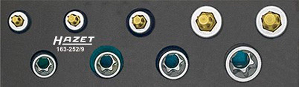 TORX sada nářadí od německého výrobce HAZET, 9 kusů v pěnové vložce, sada obsahuje nástrčné klíče 3/8" TORX E8 až E14 a hlavice 3/8" s bitem T25 až T50.