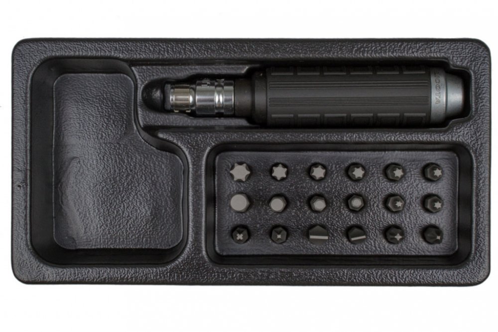 Sada úderového šroubováku a bitů v plastové výplni pojízdných vozíků a skříněk, značka LICOTA, celkem 20 kusů.