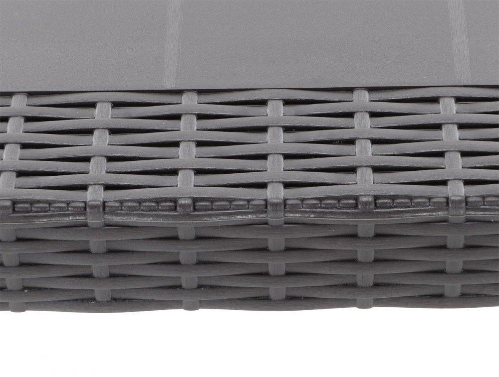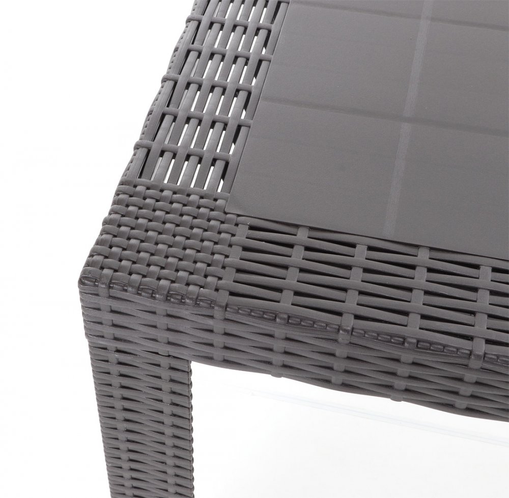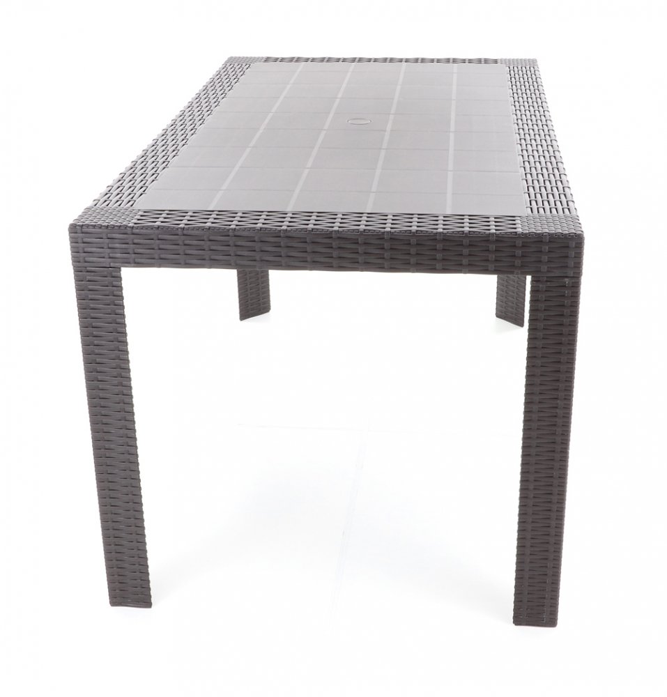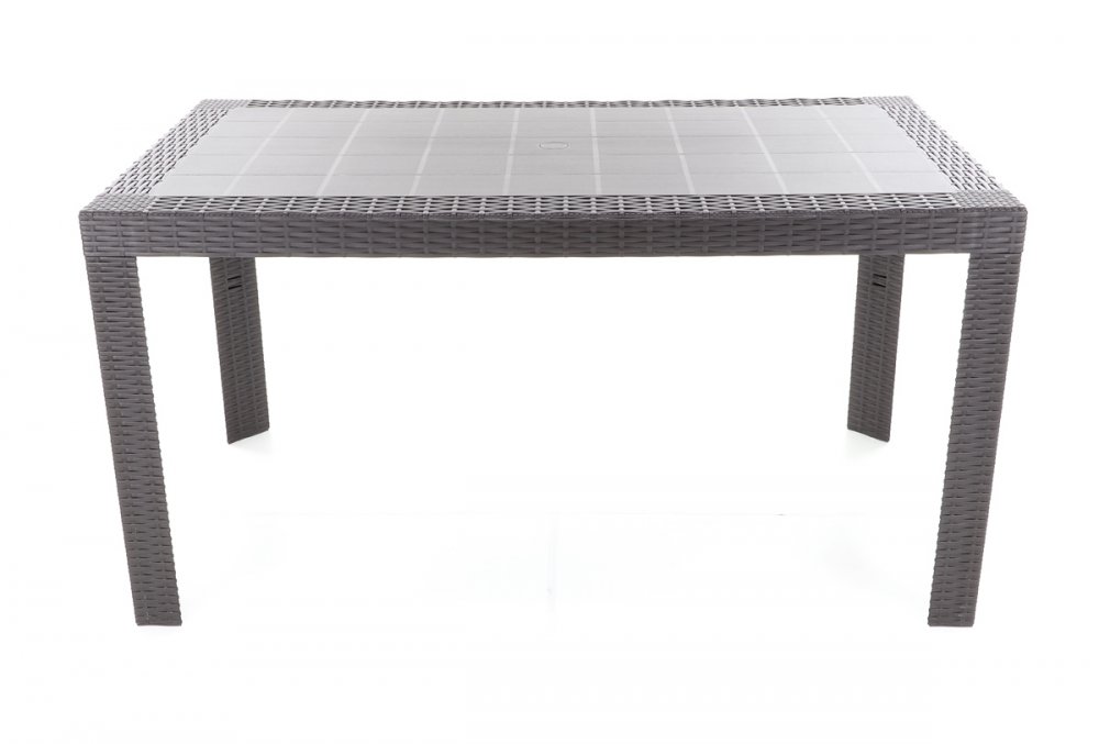 Stůl je ve tvaru obdélníku v imitaci umělého ratanu s UV filtrem.