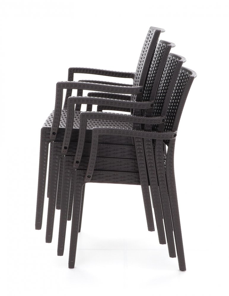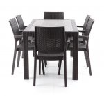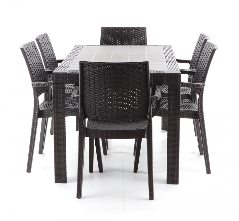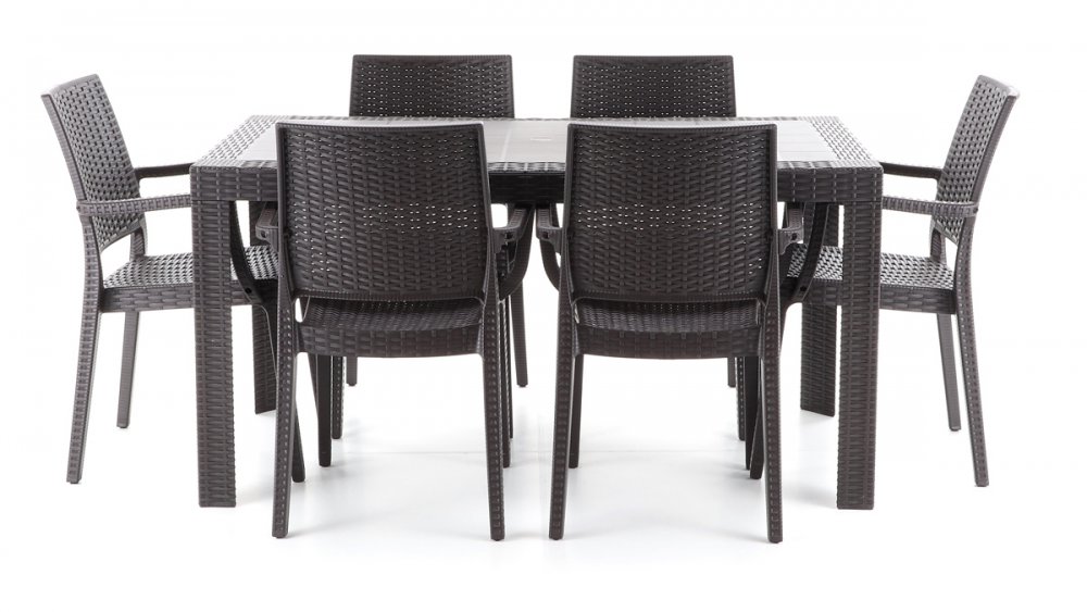 Stolová sestava se skládá z 6-ti pohodlných masivně vyztužených křesel v imitaci umělého ratanu s UV filtrem.