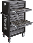 Profesionální dílenský vozík od německé značky VIGOR,vybavený celkem 344 kusy nářadí v pěnových vložkách, 7 zásuvek ve kterých se nachází 5 výplní s nářadím.