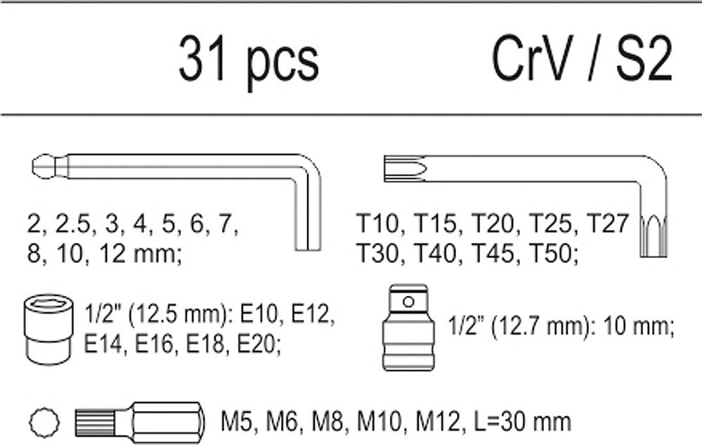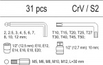 Sada 31 kusů klíčů imbus, torx a spline bity z CrV oceli. Sada je přehledně srovnána ve vložce do zásuvky z PVC.