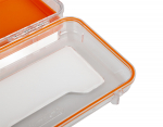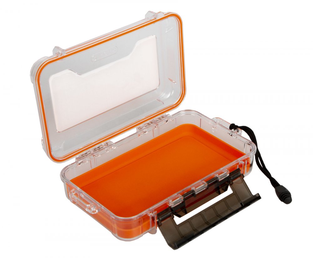 Vodotěsné pevné plastové pouzdro s poutkem pro zavěšení na zápěstí.