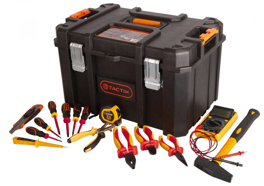 Sada 15 ks nářadí pro elektrikáře od značky Tactix a Hoteche je uložena ve vodotěsném plastovém kufru Tactix, který si můžete pořídit také samostatně.