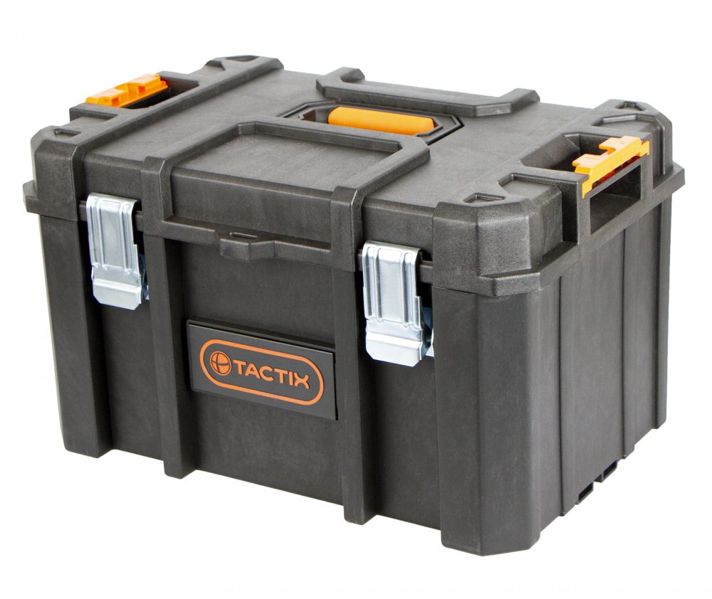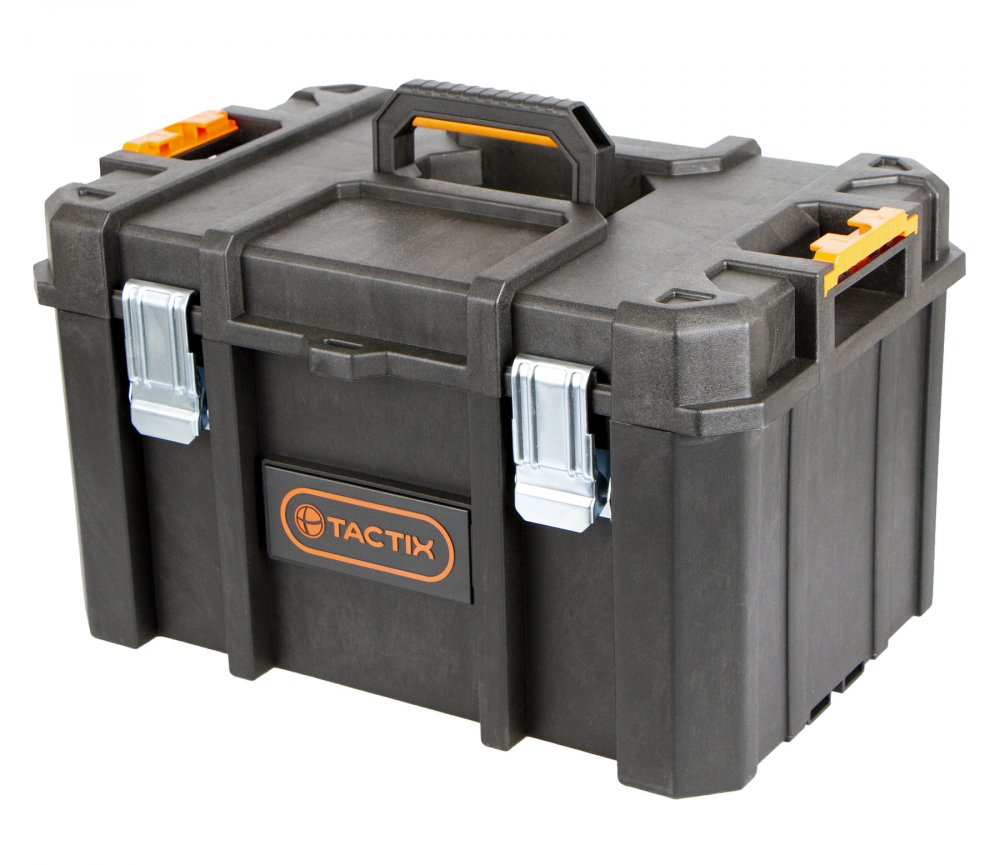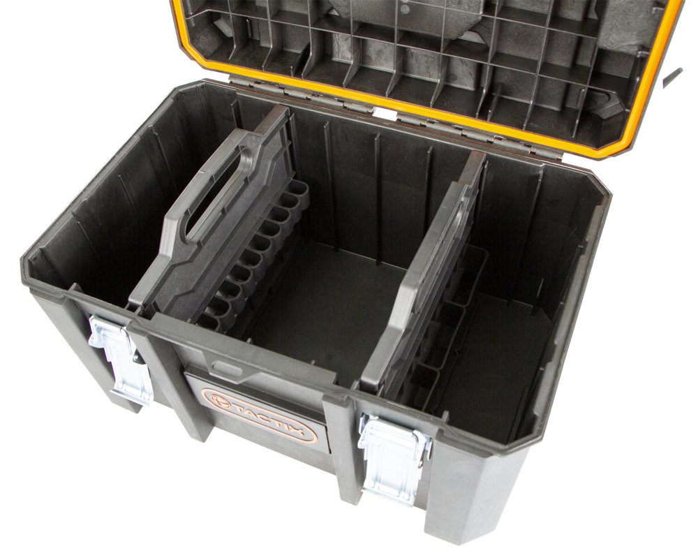 Odolný plastový kufr s vodotěsným provedením chrání obsah před vlhkostí, prachem a nečistotami. Je ideální pro bezpečné uložení nářadí a drobného materiálu.