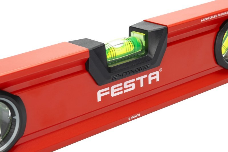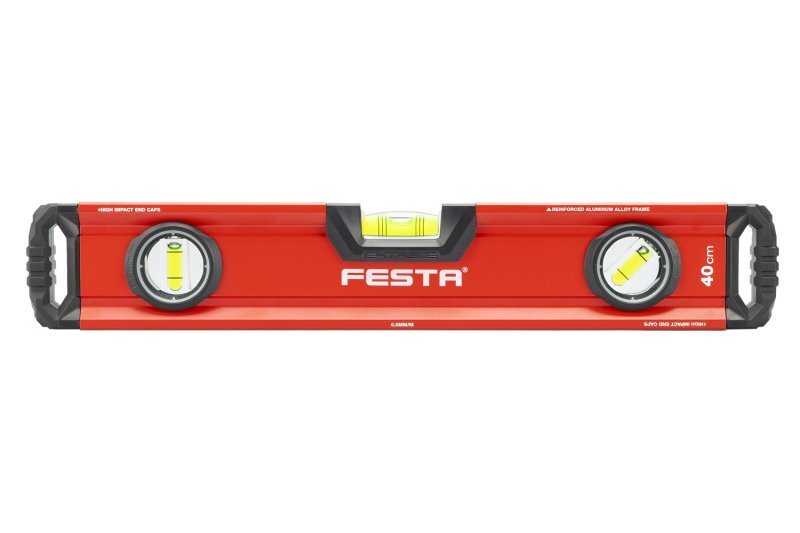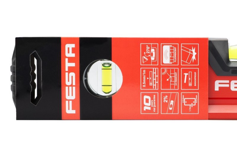 profesionální vodováha přesnost 0,5 mm / m - každý kus elektronicky testován hliníkový profilovaný a vyztužený profil síla stěny 2,2 mm 3 libely z akrylového skla nárazuvzdorné - 1 horizontální válcová* se sklonovými ryskami 1 a 2% (+válcový tvar libely, oproti kvádrové, zajišťuje skvělou viditelnost ze všech úhlů pohledu vertikální 45° UV stabilní a fluorescenční kapalina v libelách pro lepší viditelnost pogumované nárazuvzdorné koncovky pro větší odolnost při případných pádech záruka na libely 10 let