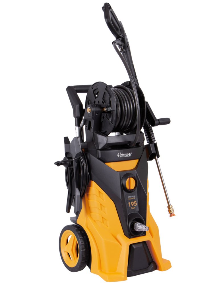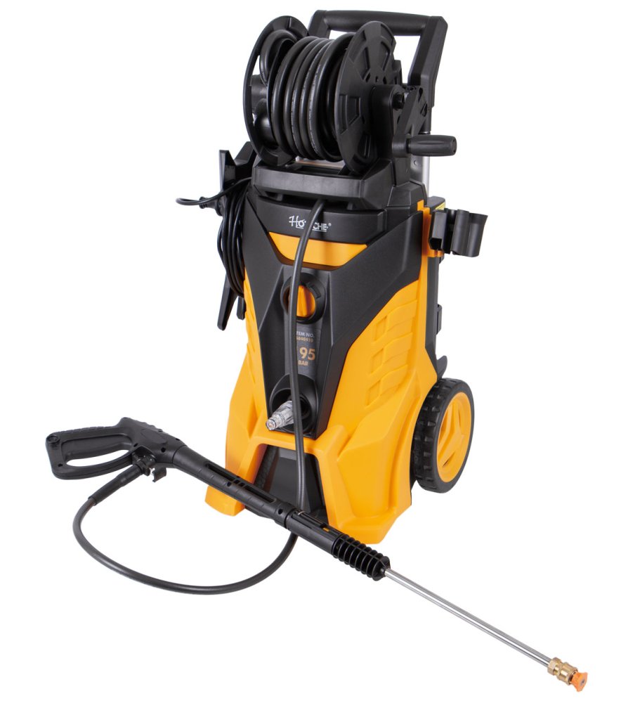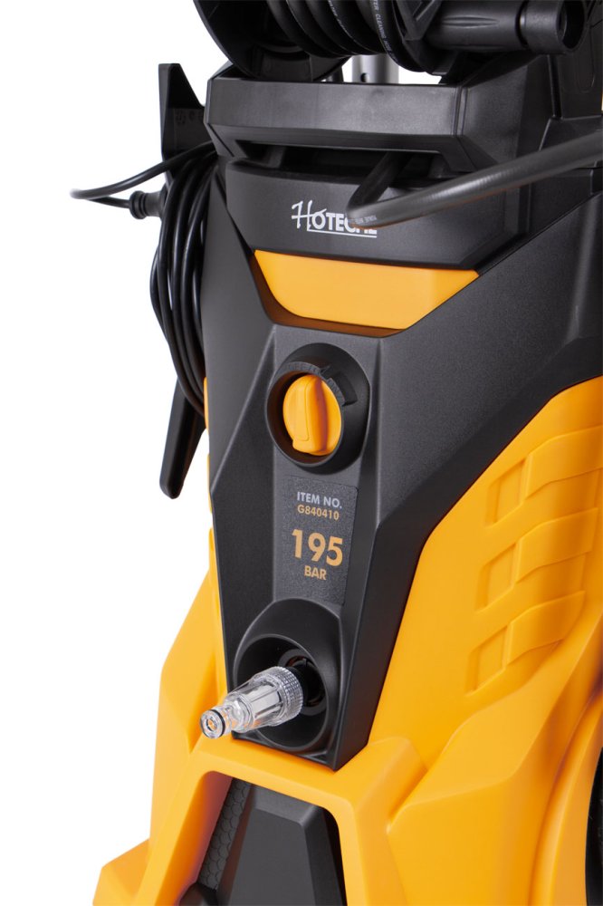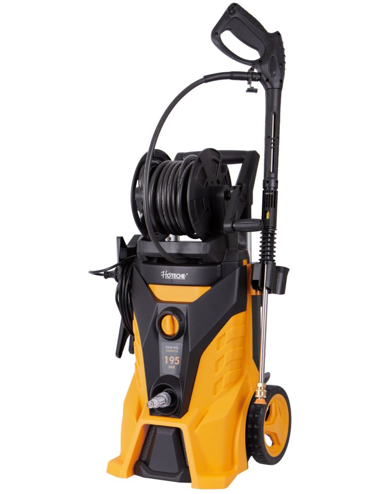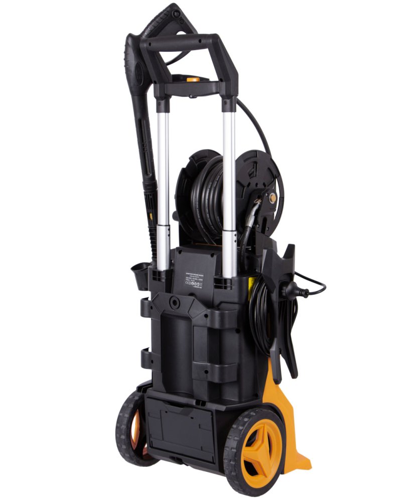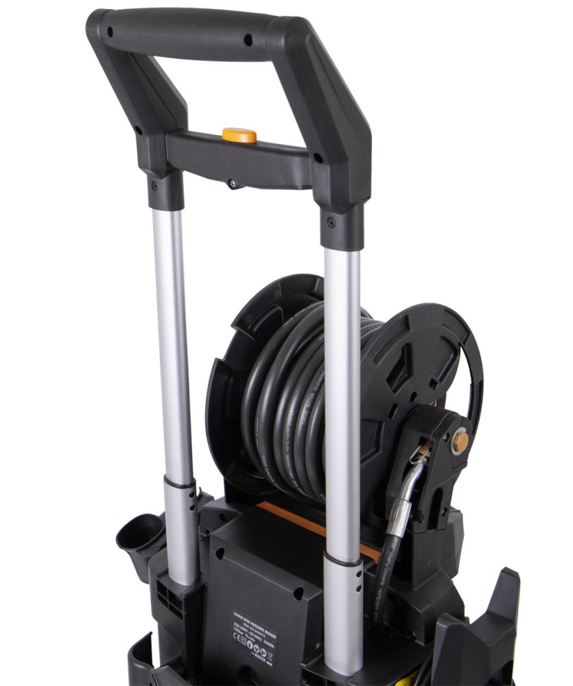 Vybavení zahrnuje: rychlospojku na pistoli i hadici, praktická transportní kolečka, teleskopické madlo, 10metrovou vysokotlakou hadici, přívodní kabel 5 m, kovové trysky, pěnovač a filtr na vstupu vody.