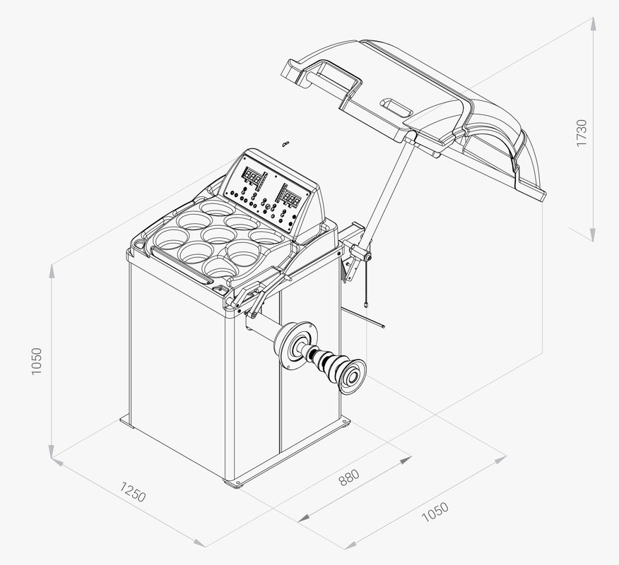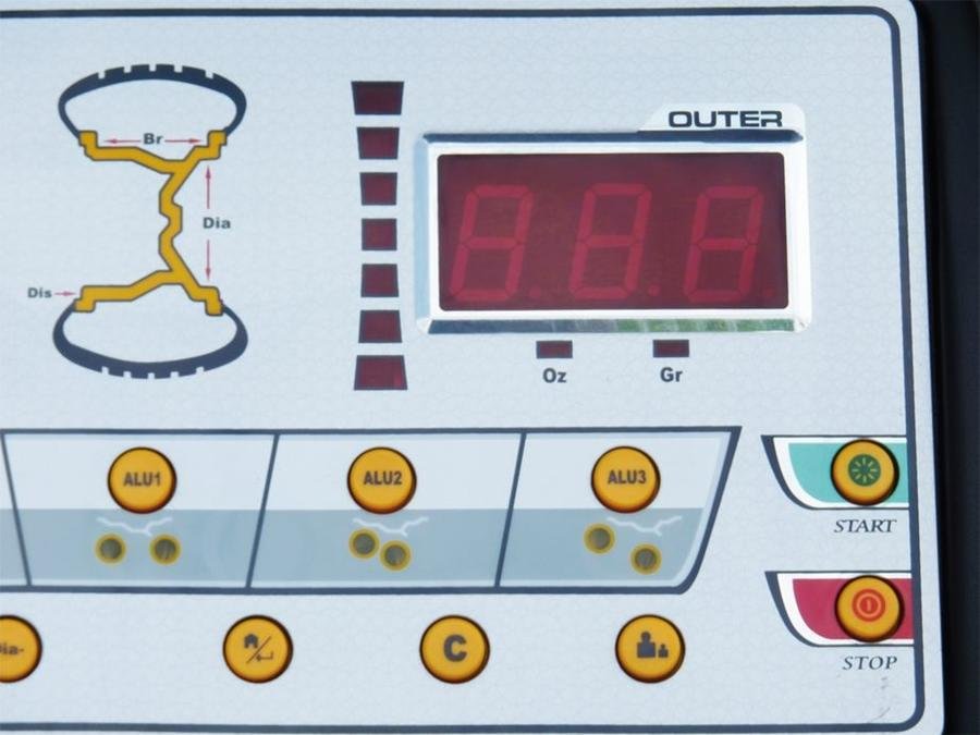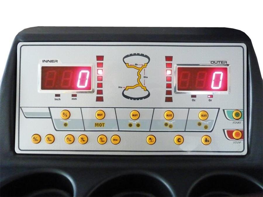 Vyvažovačka kol CB910GB má kompaktní konstrukci s malými rozměry skříně. Na první pohled zaujme velká délka vyvažovací hřídele, která umožňuje pohodlné aplikace závaží i u širokých disků.