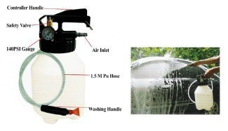 Vzduchový rozprašovač na mytí aut, maximální kapacita 6 l, tlak 30 - 100 PSI, bezpečnostní ventil.