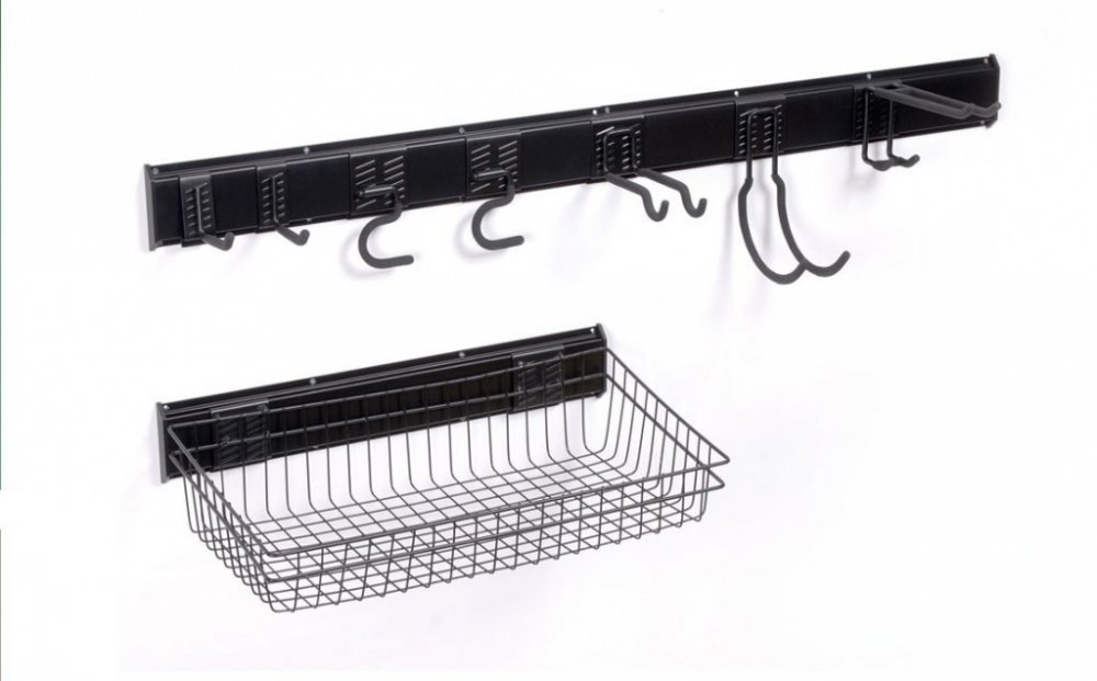 Multifunkční závěsný systém ideální pro organizaci zahradního nářadí, vysoká efektivita prostoru, 3 závěsné lišty a 7 háčků a závěsný koš.