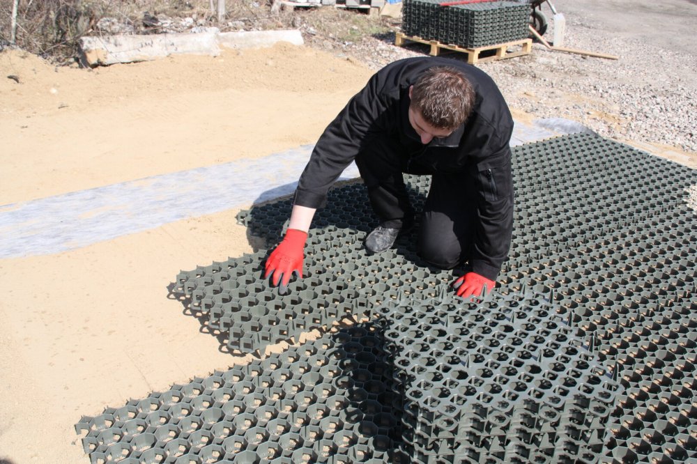 Před zahájením pokládky je nutné stávající trávník a půdu odstranit do hloubky 30-40 cm. Poté rovnoměrně rozložíme nosnou vrstvu štěrku/kameniva o hrubosti 20-30 mm. Tato vrstva by měla být vyrovnána a mechanicky zhutněna pomocí vibrační desky min. 25kN.
