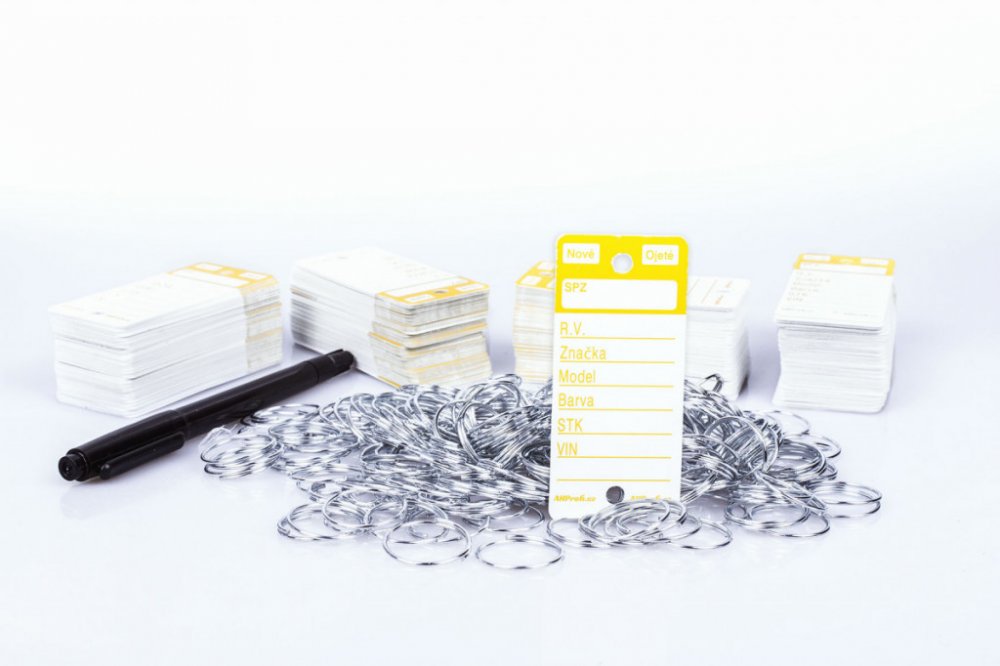 Bílé plastové visačky na klíče se žlutým potiskem jsou velkou pomůckou převážně pro autobazary, případně autosalony pro snadnou identifikaci klíčů. Jednoduše pak poznáte, kterému autu klíček patří díky vyplněným polím na jmenovce. Permanentním fixem, který je přiložen jako dárek, napíšete na cedulku na klíče SPZ, rok výroby, značku, model a barvu vozu. Datum STK a VIN, zaškrtnete zda se jedná o nové či ojeté vozidlo. Použitím permanentního fixu nemusíte řešit smývání, ušpiněné prsty apod. Na klíče připevníte rozlišovač za pomoci přiloženého kroužku, což může být o trochu složitější než instalace u modelů Easy-ON, nebo Econo ID.