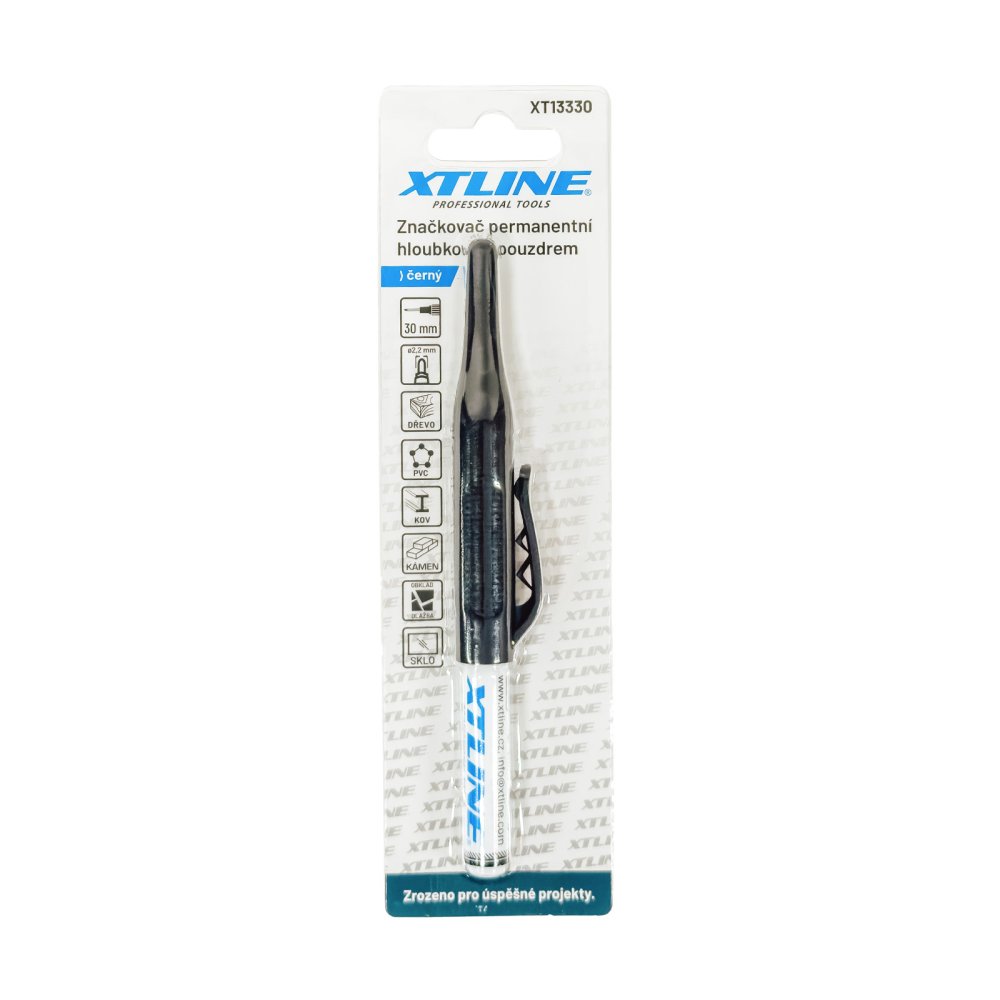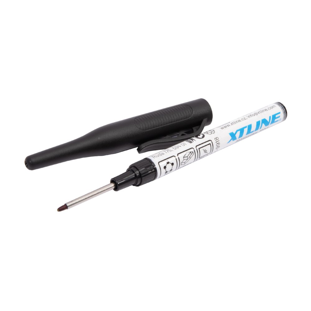Permanentní hloubkový značkovač vhodný pro celou řadu běžných suchých povrchů a stavebních materiálů, jako jsou dřevo, kovy, plasty, kámen, obklady, sklo apod. Tenký kovový hrot umožňuje pohodlné značení v hloubkovém rozsahu až 30 mm. Praktické pouzdro s klipem pro upevnění na opasek. Po dokončení značení vždy vracejte víčko značkovače zpět na hrot. Nenechávejte hrot značkovače po dobu delší než 10 minut obnažený. V opačném případě hrozí vysychání náplně nebo její snížená účinnost a viditelnost. Chraňte hrot popisovače před kontaktem s vodou, mastnotou a nečistotami. Popisovač na bázi alkoholu.